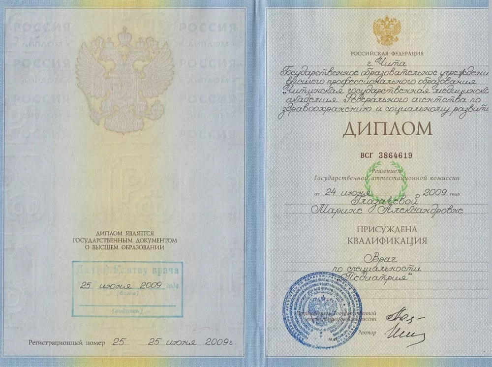 • 2009 — Читинская государственная медицинская академия (Врач по специальности "Педиатрия");